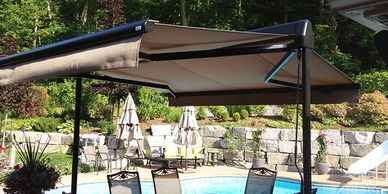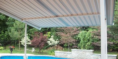 Durable aluminum frame awnings available with a variety of fabric or vinyl covers.